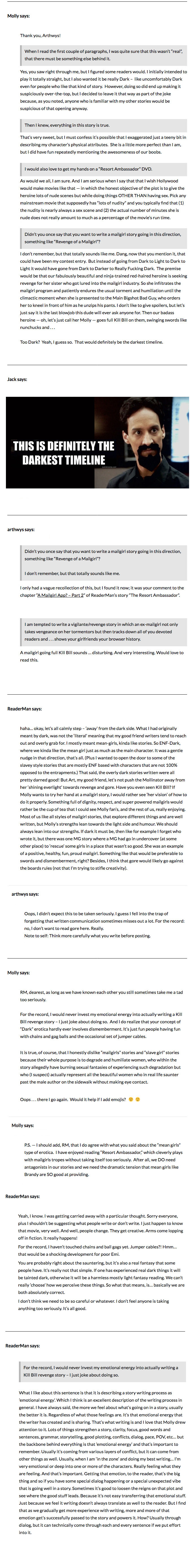 "You suggested killing," Readerman says, "not just punching. Really hard punching. Hmm, it would depart from our usual formula but . . . this could work. I need to get home and write!" With that, he grabs his briefcase and dashes out the door, calling back "don't ever change, Molly."