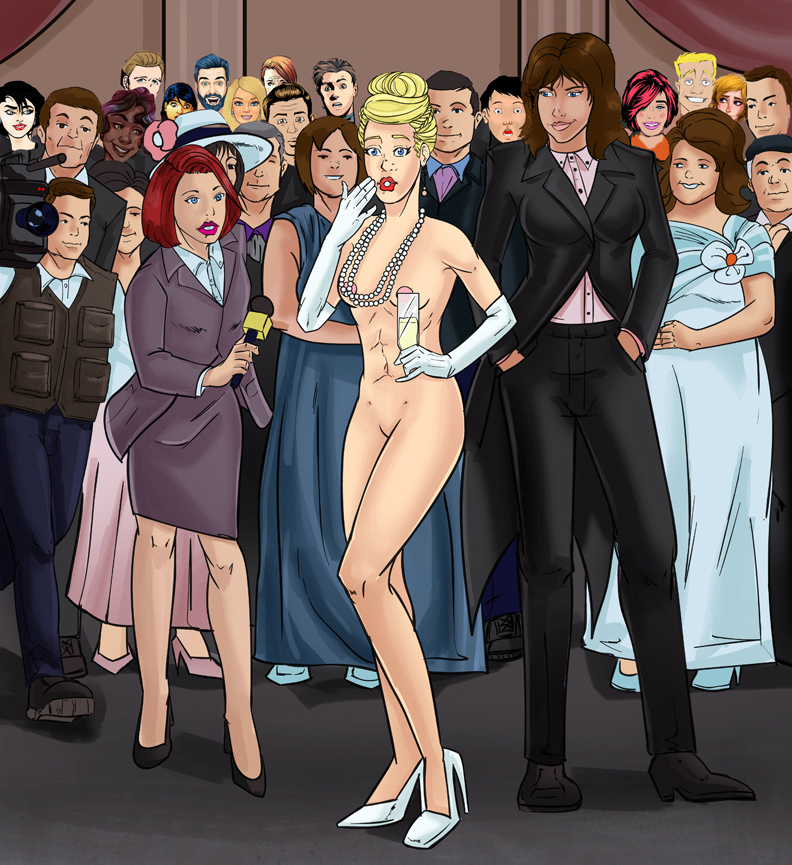 They saved the actual segment until the very last few minutes of the program, and they gave it several minutes of airtime. The reporter's voiceover gave the basic summary of the art auction and how much money was raised, but the footage was nearly all Betsy on the stage with the camera looking up at her from below. Betsy would have been mortified watching it all except that Kate's fingers were dancing on her clitoris during the entire segment. She was on the verge of climax, but too distracted by wanting to see what came next. Naturally, they used every second of her proclamation of nudism and edited out most of her babbling about the importance of the auction and its sponsor, but one of her "thanks to Peabody and Strunk-- comments was included, prompting Kate to momentarily take her hand away long enough to pump her fist in the air and declare "yes!"