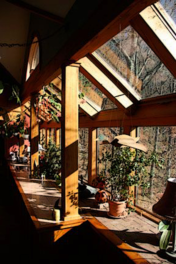 They have a very very interesting home, but I wasn't able to fully appreciate it that first evening because the rain kept us indoors and it was soon dark. But I did see that it was a partly underground home, built on a hill with the ground level up at about two feet from the ceiling all around. The whole house was built hugging into the hill, and there were skylights everywhere. But, um, they leaked. There were three spots where the heavy rain was just dripping right inside, and Emma had big houseplants positioned under each to catch the drip. She is a musician and used to tour with various bands, but then recently she met her soulmate, married him, and had a baby, Louise, who is now four months old. Emma's husband is a nice guy, but I've forgotten what he does for a living. The next morning, after he went to work, we got to see how cool their leaky house really is. It is a "passive solar" house built in the early 70s by some guy who was not an expert and did a few things wrong (thus the leaky skylights), but basically he got it right. The house is snug into a hillside facing south, and the whole roof is a series of skylights, while most of the house is below ground level and stays cool without air conditioning.